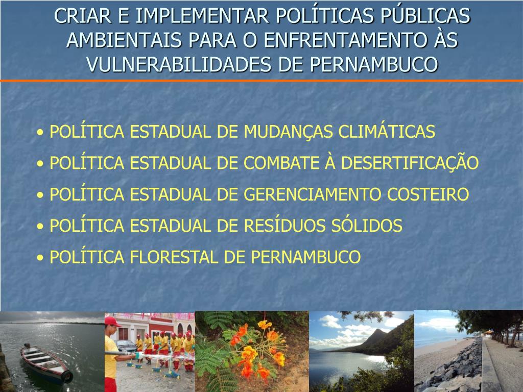 CRIAR E IMPLEMENTAR POLÍTICAS PÚBLICAS AMBIENTAIS PARA O ENFRENTAMENTO ÀS VULNERABILIDADES DE PERNAMBUCO • POLÍTICA ESTADUAL DE MUDANÇAS CLIMÁTICAS • POLÍTICA ESTADUAL DE COMBATE À DESERTIFICAÇÃO • POLÍTICA ESTADUAL DE GERENCIAMENTO COSTEIRO • POLÍTICA ESTADUAL DE RESÍDUOS SÓLIDOS • POLÍTICA FLORESTAL DE PERNAMBUCO