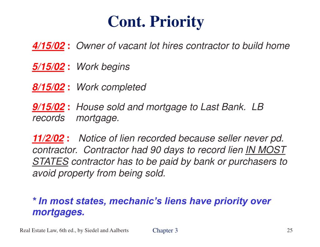 4/15/02: Owner of vacant lot hires contractor to build home 5/15/02: Work begins 8/15/02 : Work completed 9/15/02 : House sold and mortgage to Last Bank. LB records mortgage. 11/2/02: Notice of lien recorded because seller never pd. contractor. Contractor had 90 days to record lien IN MOST STATES contractor has to be paid by bank or purchasers to avoid property from being sold. * In most states, mechanic’s liens have priority over mortgages. Cont. Priority Chapter 3 Real Estate Law, 6th ed., by Siedel and Aalberts