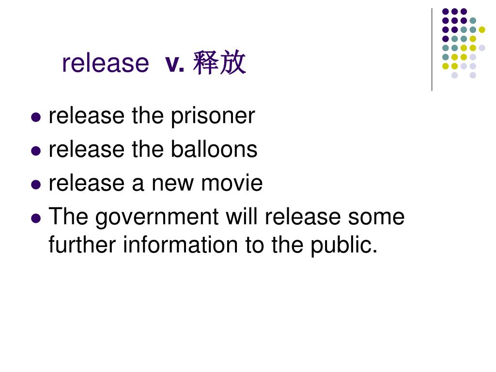 release v. 释放 • release the prisoner • release the balloons • release a new movie • The government will release some further information to the public.