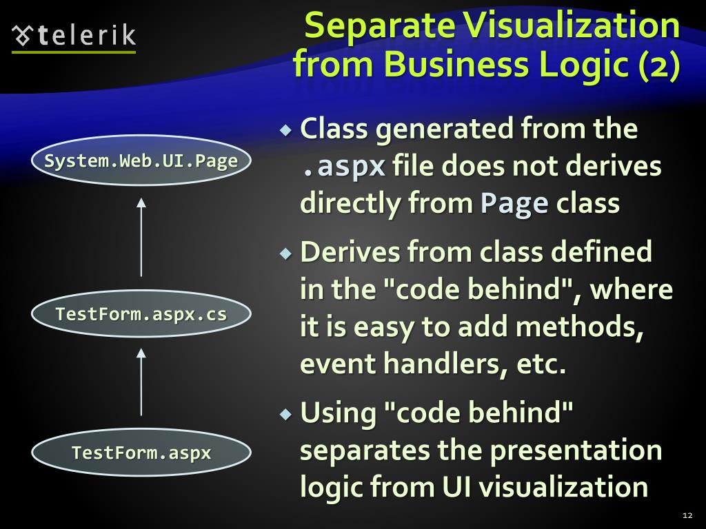 Separate Visualization from Business Logic • Traditional Web development keep HTML and programming code in one file (PHP,ASP, …) • Hard to read, understand and maintain • Hard to test and debug • ASP.NET splits the Web pages into two parts: • .aspx file containing HTML for visualization • "Code behind" files (.cs for C#) containing presentation logic for particular page