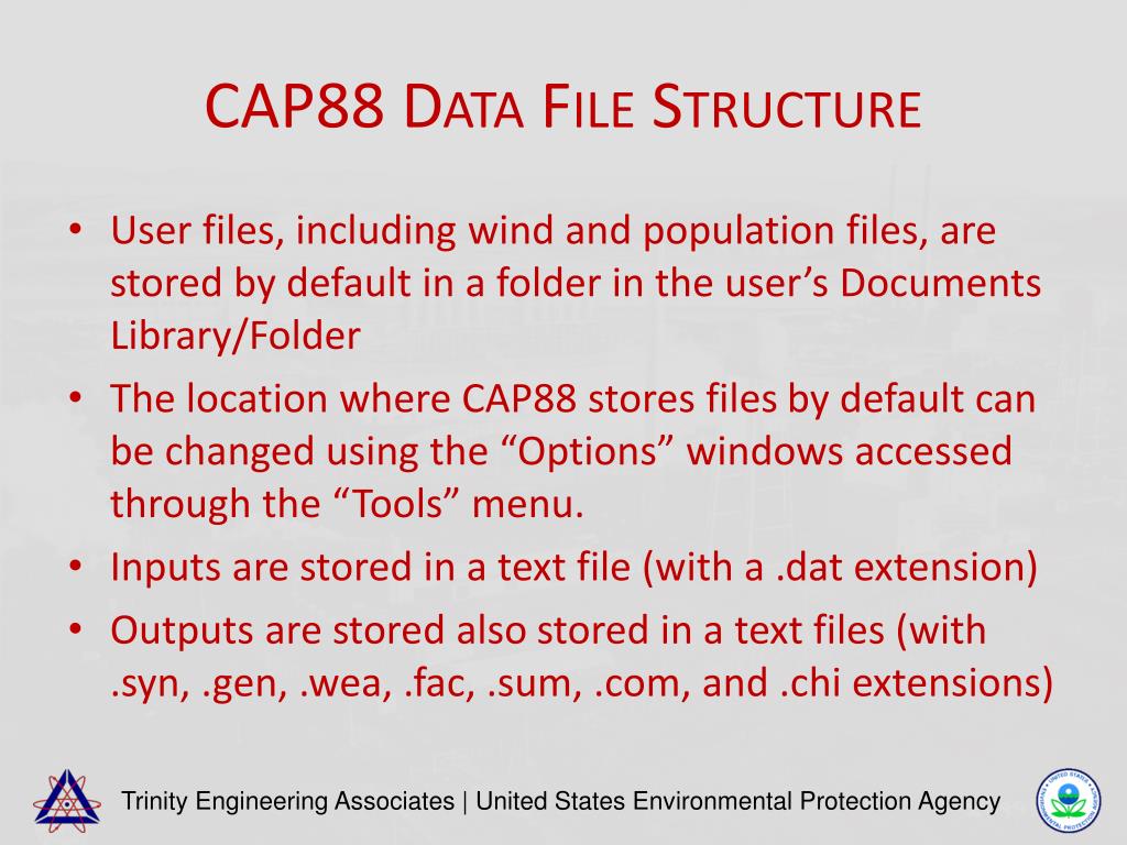 CAP88 Data File Structure • User files, including wind and population files, are stored by default in a folder in the user’s Documents Library/Folder • The location where CAP88 stores files by default can be changed using the “Options” windows accessed through the “Tools” menu. • Inputs are stored in a text file (with a .dat extension) • Outputs are stored also stored in a text files (with .syn, .gen, .wea, .fac, .sum, .com, and .chi extensions)
