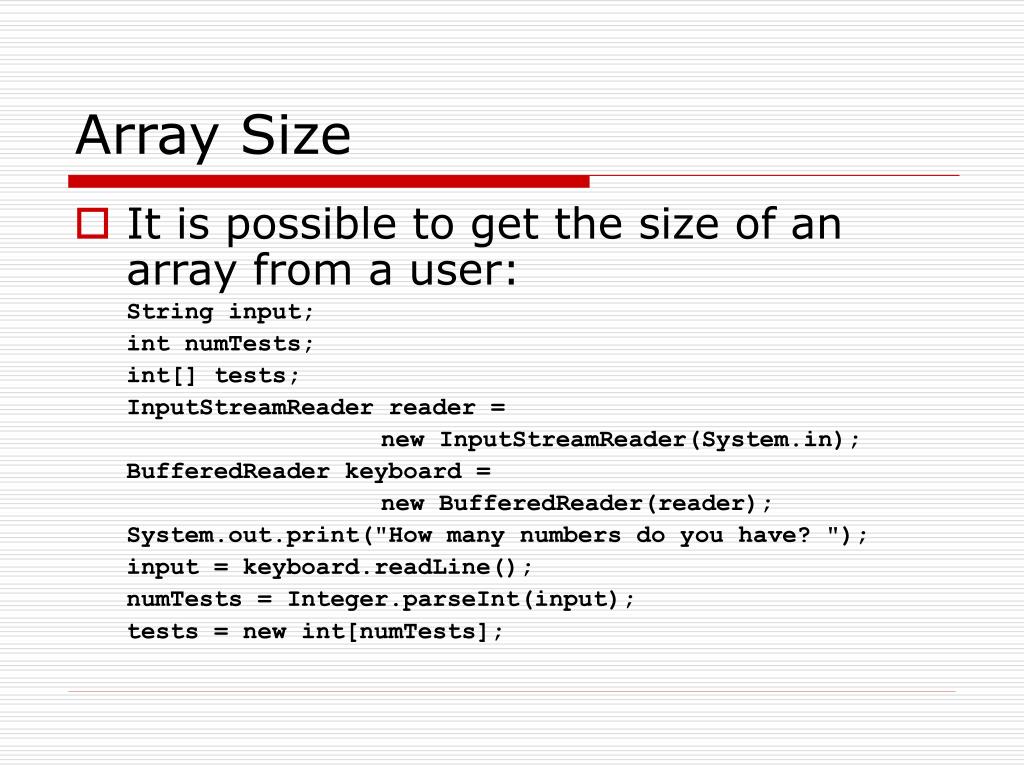 Array Size • It is possible to get the size of an array from a user: String input; int numTests; int[] tests; InputStreamReader reader = new InputStreamReader(System.in); BufferedReader keyboard = new BufferedReader(reader); System.out.print("How many numbers do you have? "); input = keyboard.readLine(); numTests = Integer.parseInt(input); tests = new int[numTests];