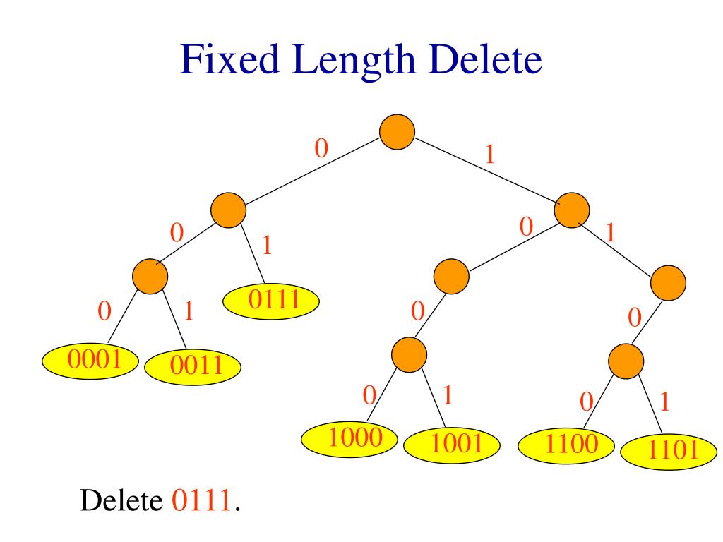 0 1 0 0 1 0 1 0 0 0 1 0 1 1000 0011 0001 1100 1101 1001 Fixed Length Delete Delete 0111. One compare.