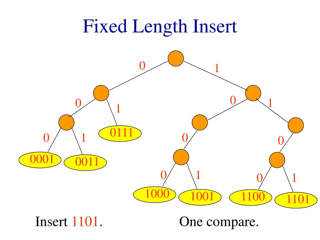 1 0 1 0 0 1 0 0 0 1 0 1 1000 0011 0001 0111 1100 1101 1001 Fixed Length Insert 0 1 Insert 1101. One compare.