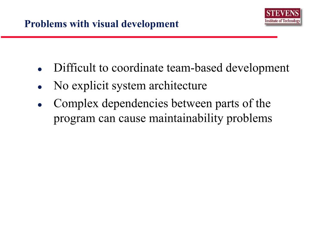 Problems with visual development • Difficult to coordinate team-based development • No explicit system architecture • Complex dependencies between parts of the program can cause maintainability problems