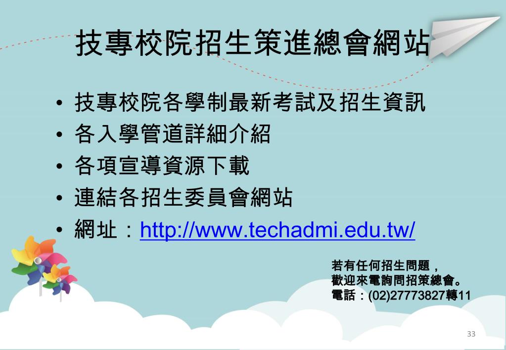 技專校院招生策進總會網站 • 技專校院各學制最新考試及招生資訊 • 各入學管道詳細介紹 • 各項宣導資源下載 • 連結各招生委員會網站 • 網址:http://www.techadmi.edu.tw/ 若有任何招生問題,歡迎來電詢問招策總會。 電話:(02)27773827轉11