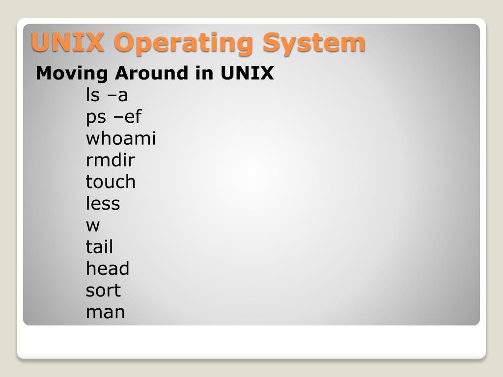 Moving Around in UNIX ls–a ps–ef whoami rmdir touch less w tail head sort man UNIX Operating System