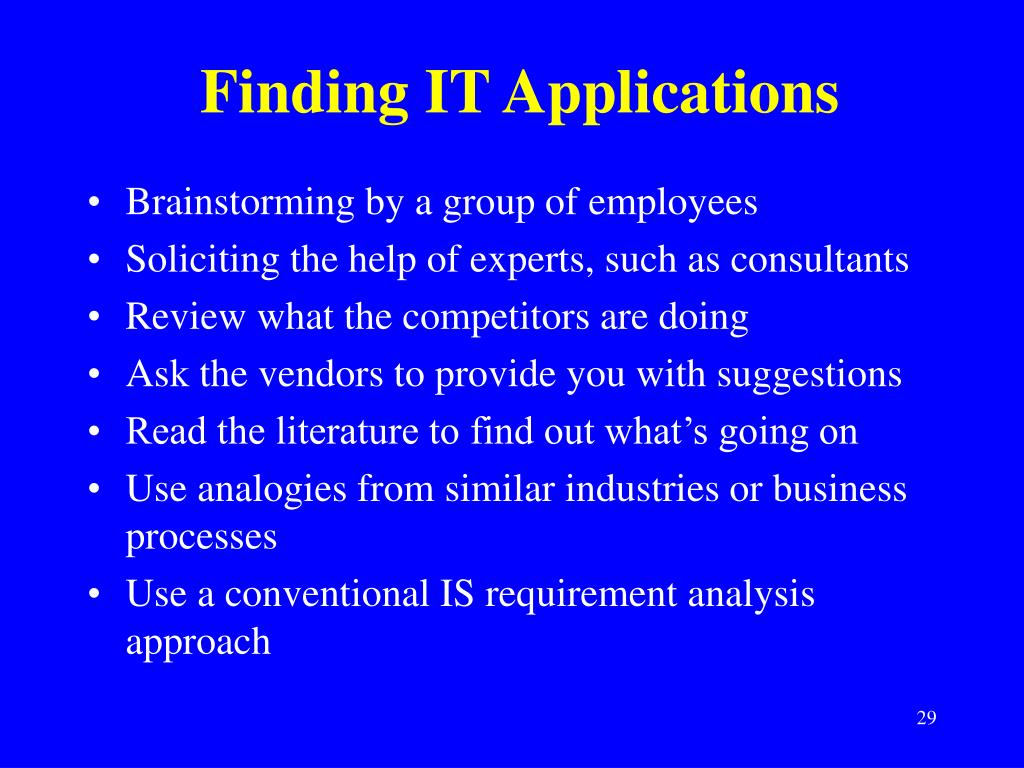 Finding IT Applications • Brainstorming by a group of employees • Soliciting the help of experts, such as consultants • Review what the competitors are doing • Ask the vendors to provide you with suggestions • Read the literature to find out what’s going on • Use analogies from similar industries or business processes • Use a conventional IS requirement analysis approach
