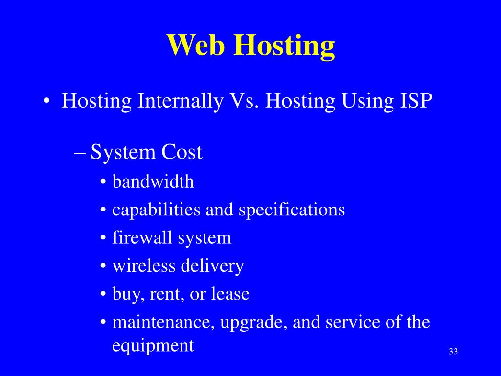 Web Hosting • Hosting Internally Vs. Hosting Using ISP • System Cost • bandwidth • capabilities and specifications • firewall system • wireless delivery • buy, rent, or lease • maintenance, upgrade, and service of the equipment