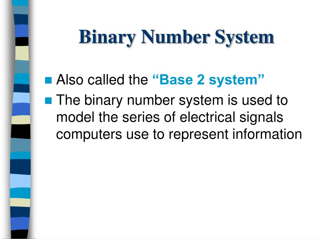 Binary Number System • Also called the “Base 2 system” • The binary number system is used to model the series of electrical signals computers use to represent information