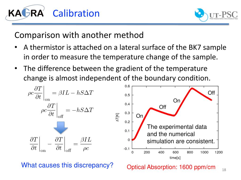 Calibration Comparison with another method • A thermistor is attached on a lateral surface of the BK7 sample in order to measure the temperature change of the sample. • The difference between the gradient of the temperature change is almost independent of the boundary condition. Off On Off On The experimental data and the numerical simulation are consistent. What causes this discrepancy? Optical Absorption: 1600 ppm/cm
