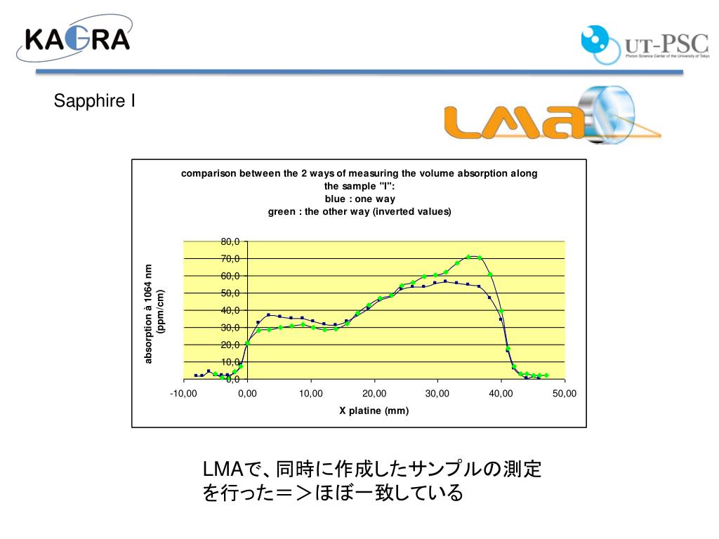 Sapphire: Preliminary results 10 Samples fromCSI have been measured Name Absorption [ppm/cm] preliminary • AA149 と P401は小さな吸収係数を実現した。 • AC150 はとても大きな値を示した? • P401 場所により2倍違う? • この結果は製造者であるCSに連絡した。