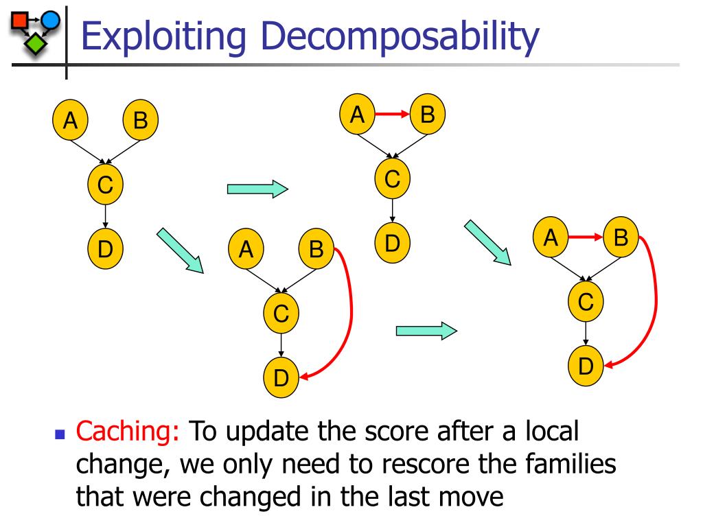 Exploiting Decomposability • Caching:To update the score after a local change, we only need to rescore the families that were changed in the last move A B A B C C A B D D A B C C D D