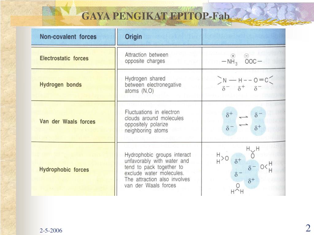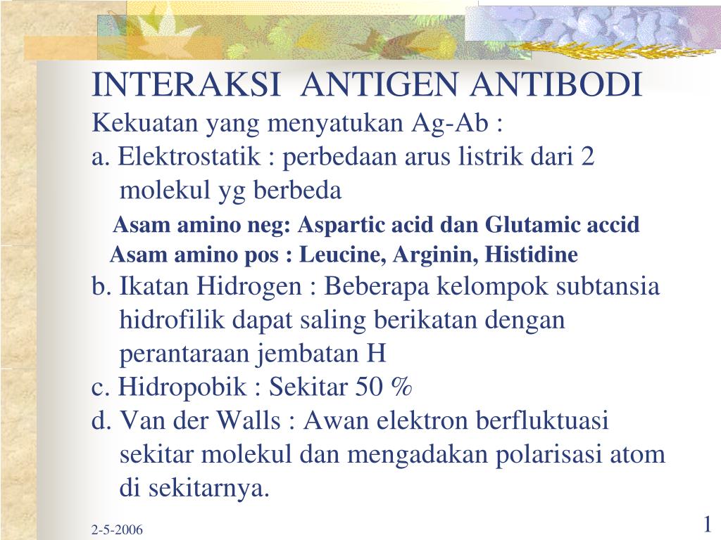 INTERAKSI ANTIGEN ANTIBODIKekuatan yang menyatukan Ag-Ab :a. Elektrostatik : perbedaan arus listrik dari 2 molekul yg berbedaAsam amino neg: Aspartic acid dan Glutamic accid Asam amino pos : Leucine, Arginin, Histidineb. Ikatan Hidrogen : Beberapa kelompok subtansia hidrofilik dapat saling berikatan dengan perantaraan jembatan H c. Hidropobik : Sekitar 50 %d. Van der Walls : Awan elektron berfluktuasi sekitar molekul dan mengadakan polarisasi atom di sekitarnya.