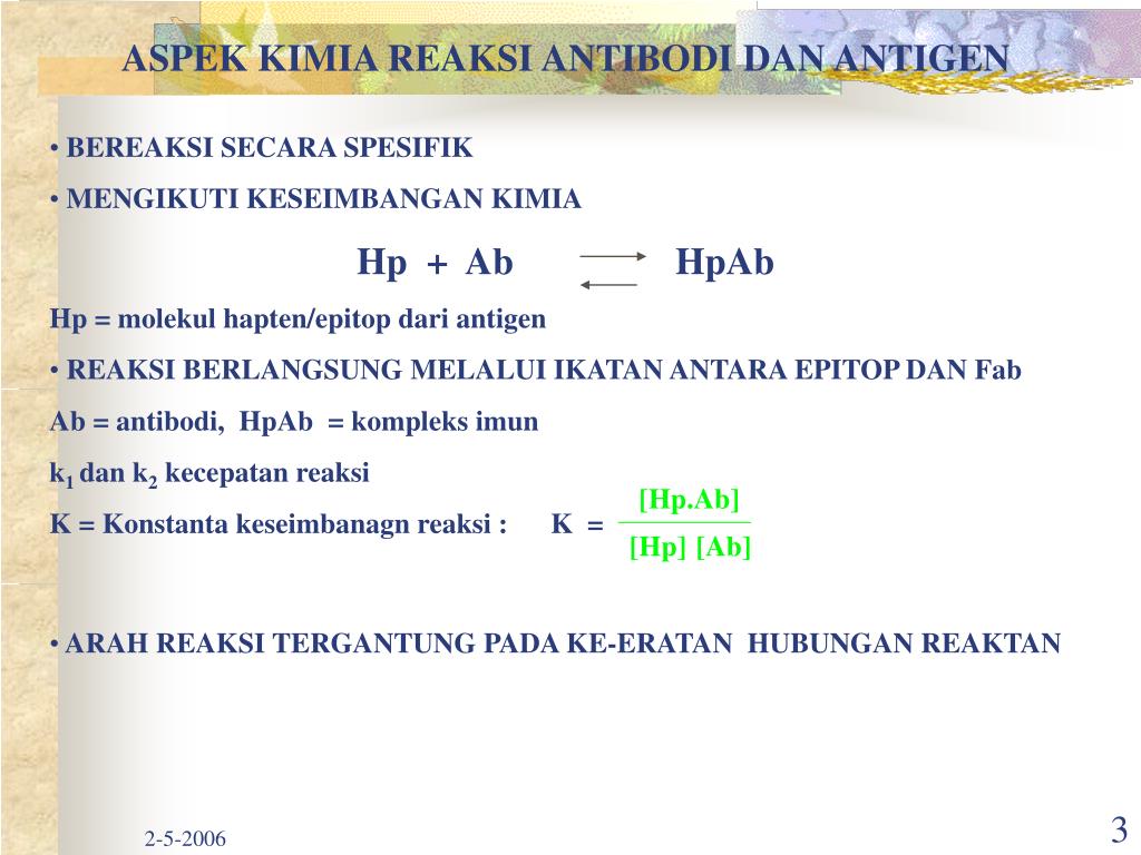 ASPEK KIMIA REAKSI ANTIBODI DAN ANTIGEN • BEREAKSI SECARA SPESIFIK • MENGIKUTI KESEIMBANGAN KIMIA • Hp + Ab HpAb • Hp = molekul hapten/epitop dari antigen • REAKSI BERLANGSUNG MELALUI IKATAN ANTARA EPITOP DAN Fab • Ab = antibodi, HpAb = kompleks imun • k1 dan k2 kecepatan reaksi • K = Konstanta keseimbanagn reaksi : K = • ARAH REAKSI TERGANTUNG PADA KE-ERATAN HUBUNGAN REAKTAN [Hp.Ab] [Hp] [Ab]
