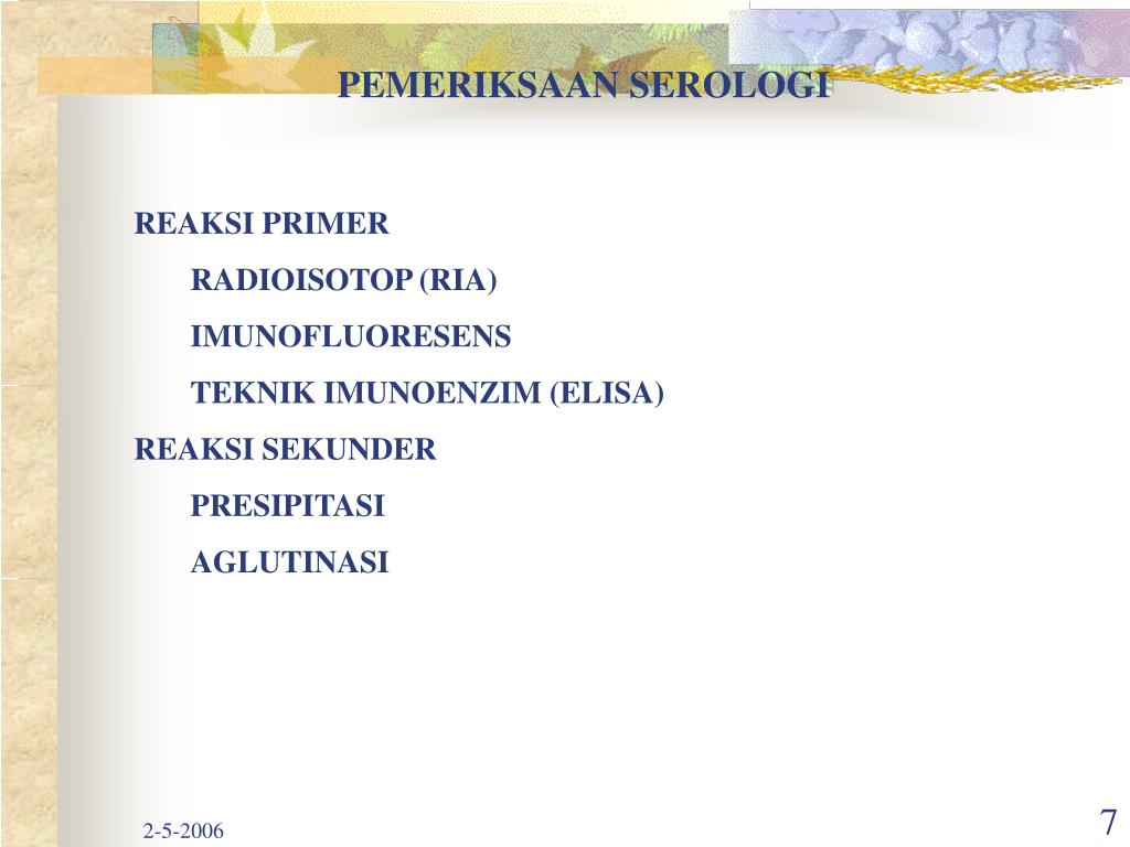 PEMERIKSAAN SEROLOGI • REAKSI PRIMER • RADIOISOTOP (RIA) • IMUNOFLUORESENS • TEKNIK IMUNOENZIM (ELISA) • REAKSI SEKUNDER • PRESIPITASI • AGLUTINASI