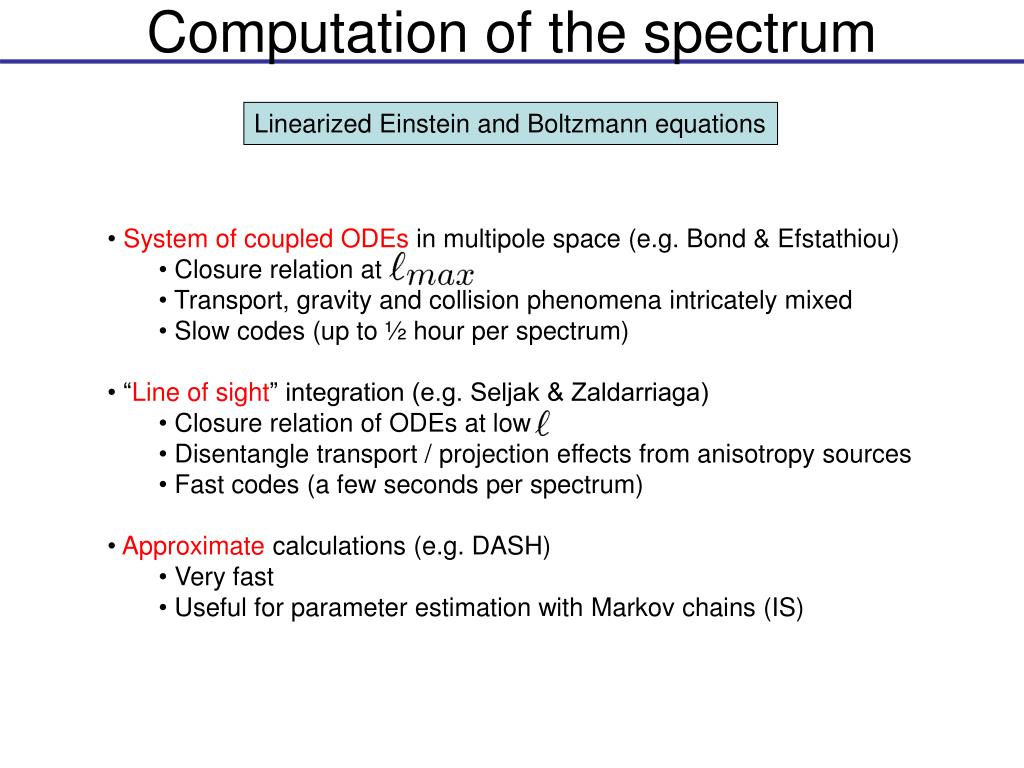 Computation of the spectrum • System of coupled ODEs in multipole space (e.g. Bond & Efstathiou) • Closure relation at • Transport, gravity and collision phenomena intricately mixed • Slow codes (up to ½ hour per spectrum) • “Line of sight” integration (e.g. Seljak & Zaldarriaga) • Closure relation of ODEs at low • Disentangle transport / projection effects from anisotropy sources • Fast codes (a few seconds per spectrum) • Approximate calculations (e.g. DASH) • Very fast • Useful for parameter estimation with Markov chains (IS) Linearized Einstein and Boltzmann equations
