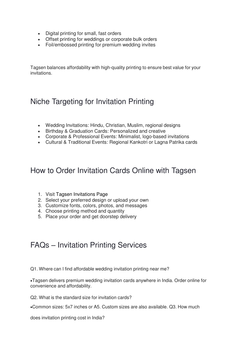Digitalprintingforsmall,fastorders • Offsetprintingforweddingsorcorporatebulkorders • Foil/embossedprintingforpremiumweddinginvites Tagsenbalancesaffordabilitywithhigh-qualityprintingtoensurebestvalueforyourinvitations. NicheTargetingforInvitationPrinting • WeddingInvitations:Hindu,Christian,Muslim,regionaldesigns • Birthday&GraduationCards:Personalizedandcreative • Corporate&ProfessionalEvents:Minimalist,logo-basedinvitations • Cultural&TraditionalEvents:RegionalKankotriorLagnaPatrikacards HowtoOrderInvitationCardsOnlinewithTagsen VisitTagsenInvitationsPage Selectyourpreferreddesignoruploadyourown Customizefonts,colors,photos,andmessages Chooseprintingmethodandquantity Placeyourorderandgetdoorstepdelivery FAQs–InvitationPrintingServices • Q1.WherecanIfindaffordableweddinginvitationprintingnearme? • TagsendeliverspremiumweddinginvitationcardsanywhereinIndia.Orderonlineforconvenienceandaffordability. • Q2.Whatisthestandardsizeforinvitationcards? • Commonsizes:5x7inchesorA5.Customsizesarealsoavailable.Q3.HowmuchdoesinvitationprintingcostinIndia?