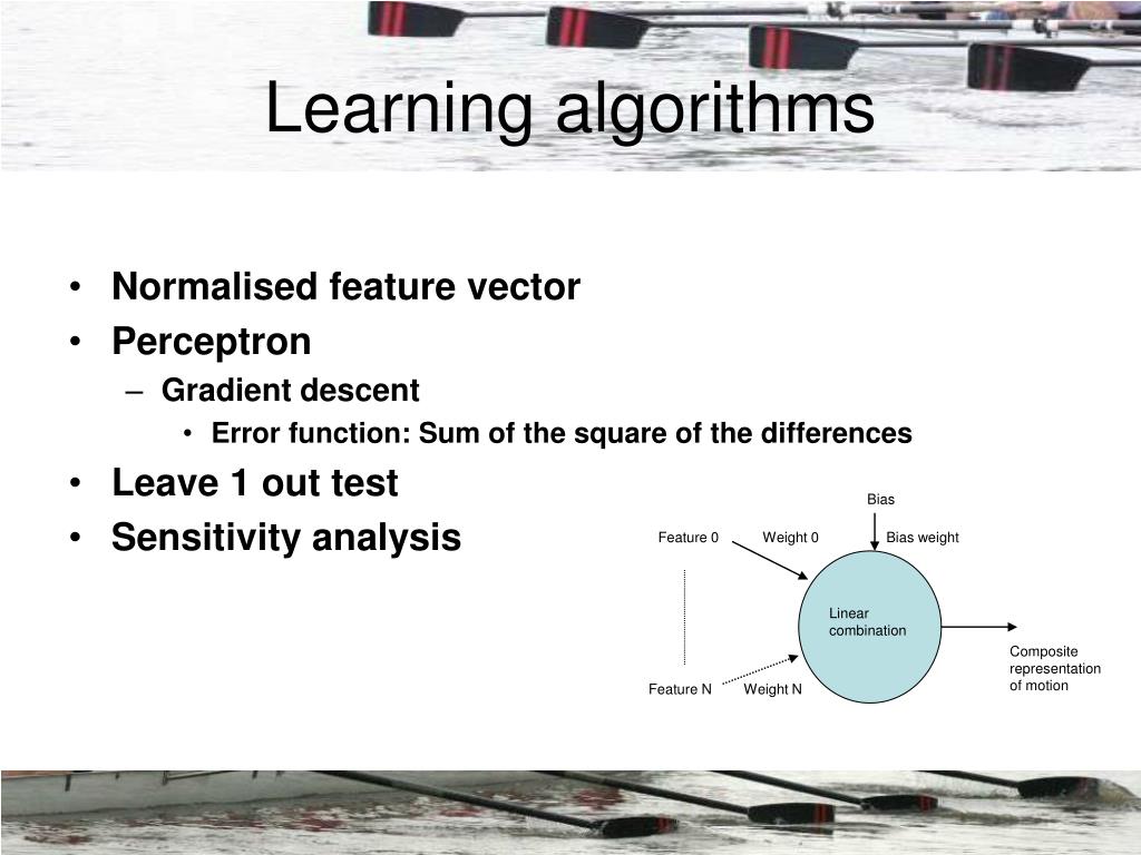 Learning algorithms • Normalised feature vector • Perceptron • Gradient descent • Error function: Sum of the square of the differences • Leave 1 out test • Sensitivity analysis Bias Feature 0 Weight 0 Bias weight Linear combination Composite representation of motion Feature N Weight N