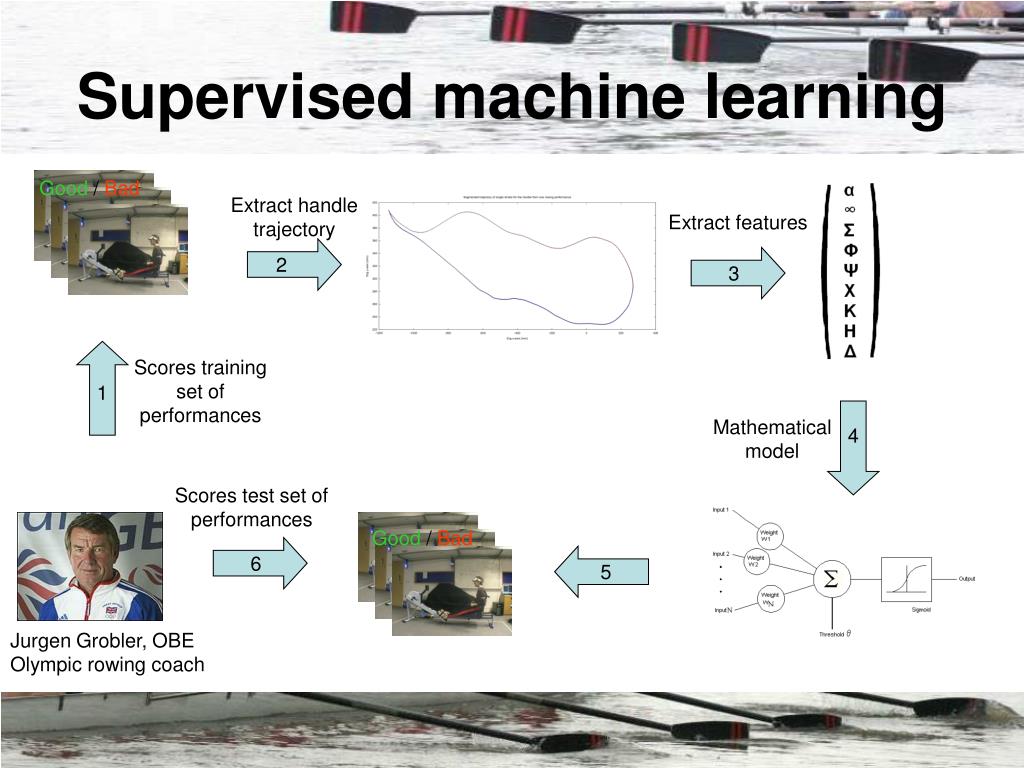Supervised machine learning Good / Bad Extract handle trajectory Extract features 2 3 Scores training set of performances 1 Mathematical model 4 Scores test set of performances Good / Bad 6 5 Jurgen Grobler, OBE Olympic rowing coach