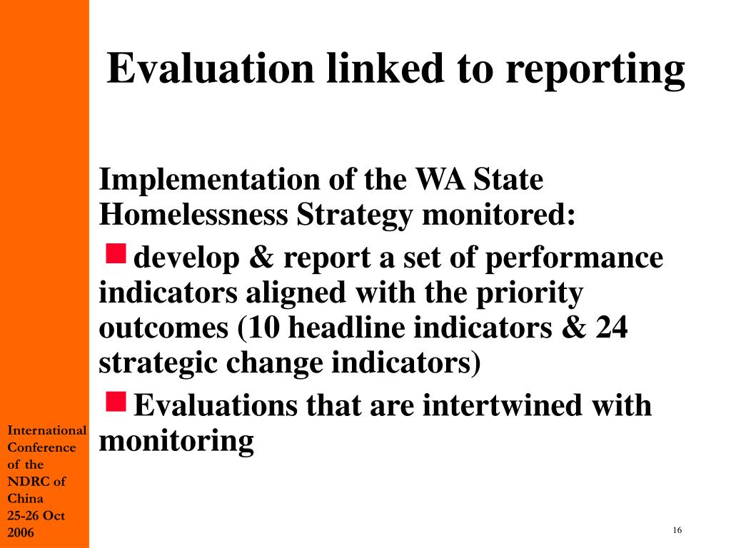 Evaluation linked to reporting Implementation of the WA State Homelessness Strategy monitored: • develop & report a set of performance indicators aligned with the priority outcomes (10 headline indicators & 24 strategic change indicators) • Evaluations that are intertwined with monitoring