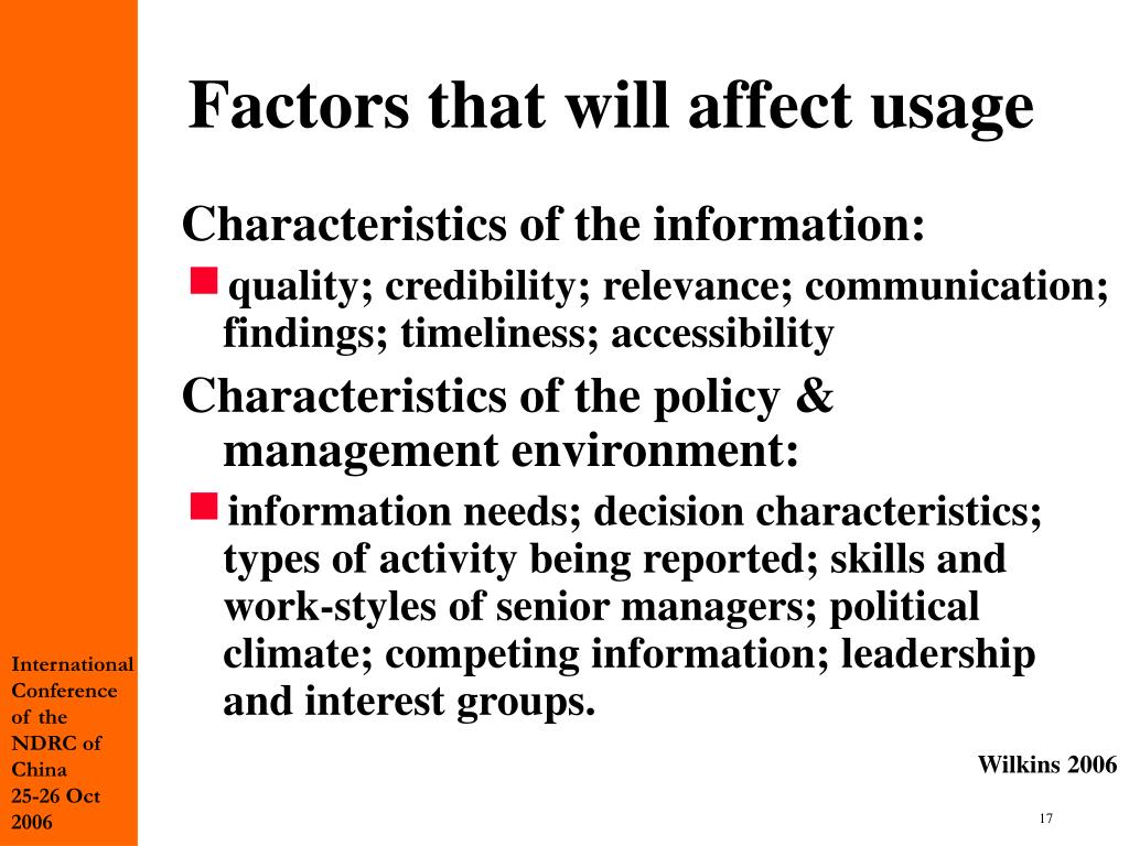 Factors that will affect usage Characteristics of the information: • quality; credibility; relevance; communication; findings; timeliness; accessibility Characteristics of the policy & management environment: • information needs; decision characteristics; types of activity being reported; skills and work-styles of senior managers; political climate; competing information; leadership and interest groups. Wilkins 2006