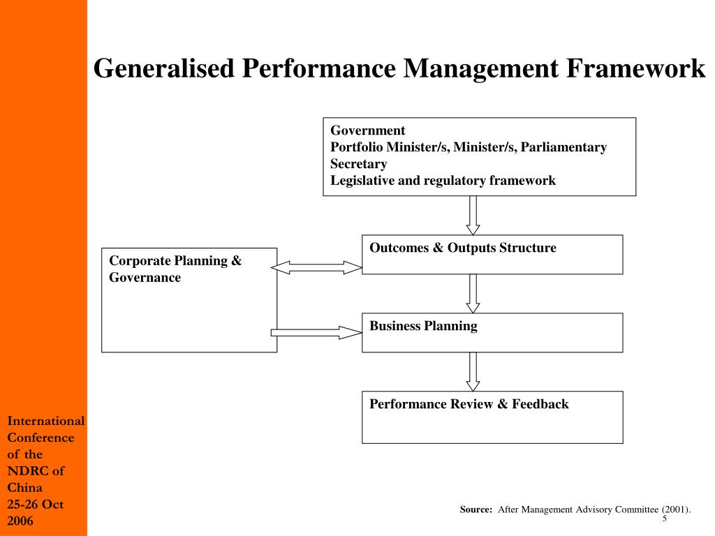 Government Portfolio Minister/s, Minister/s, Parliamentary Secretary Legislative and regulatory framework Outcomes & Outputs Structure Corporate Planning & Governance Business Planning Performance Review & Feedback Generalised Performance Management Framework Source: After Management Advisory Committee (2001).