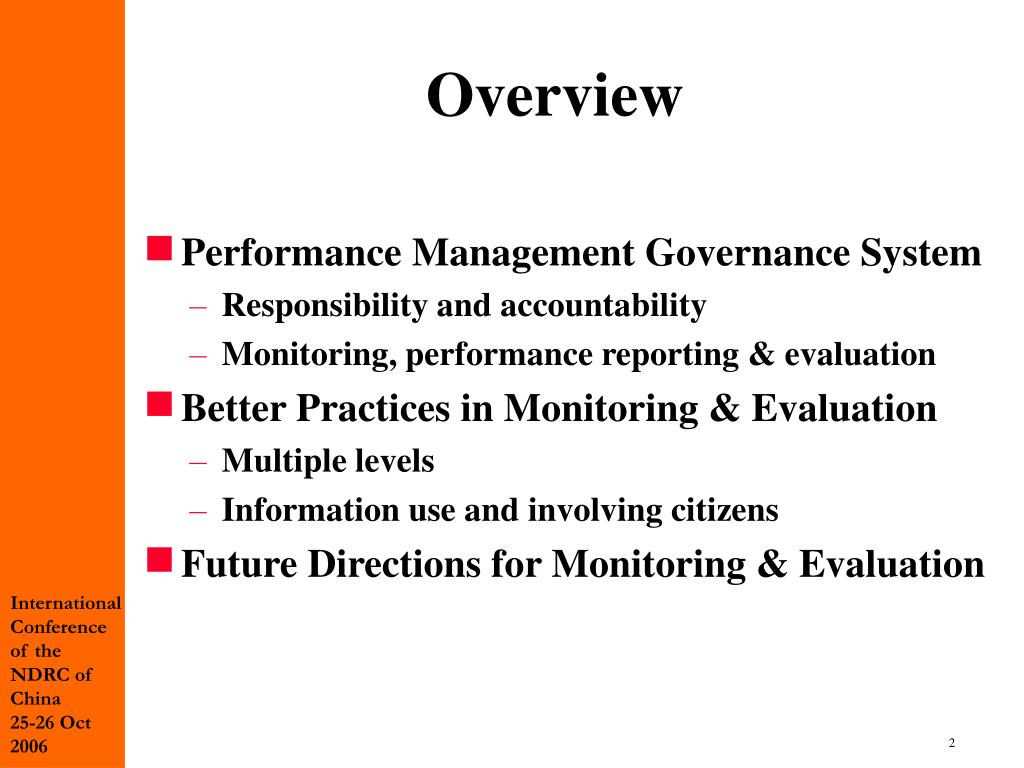 Overview • Performance Management Governance System • Responsibility and accountability • Monitoring, performance reporting & evaluation • Better Practices in Monitoring & Evaluation • Multiple levels • Information use and involving citizens • Future Directions for Monitoring & Evaluation