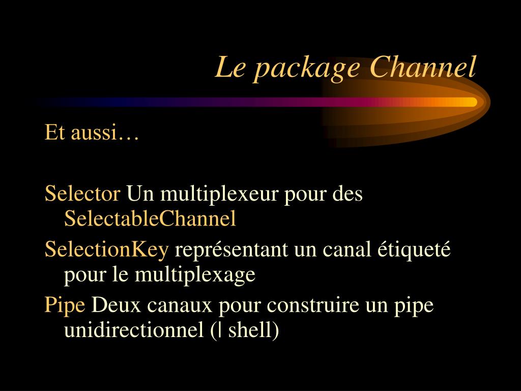 Le package Channel Et aussi… Selector Un multiplexeur pour des SelectableChannel SelectionKey représentant un canal étiqueté pour le multiplexage Pipe Deux canaux pour construire un pipe unidirectionnel (| shell)