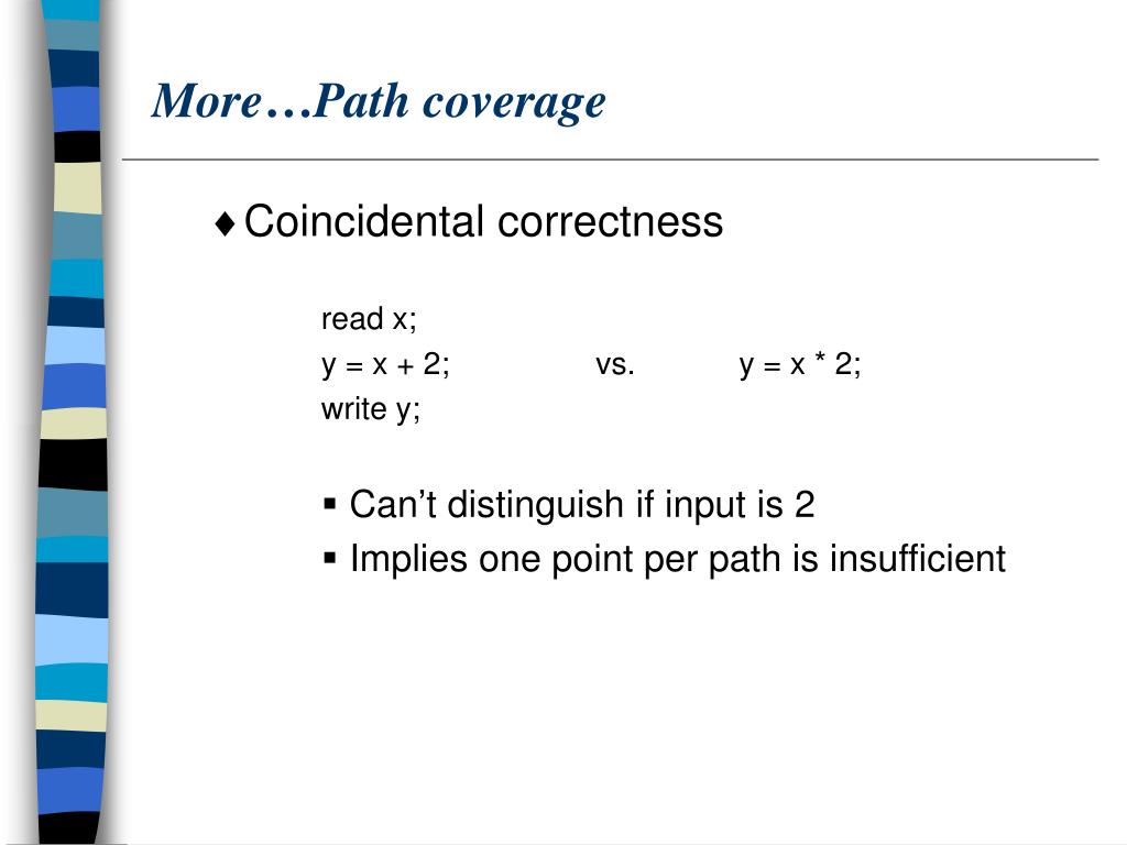 More…Path coverage • Coincidental correctness read x; y = x + 2; vs. y = x * 2; write y; • Can’t distinguish if input is 2 • Implies one point per path is insufficient
