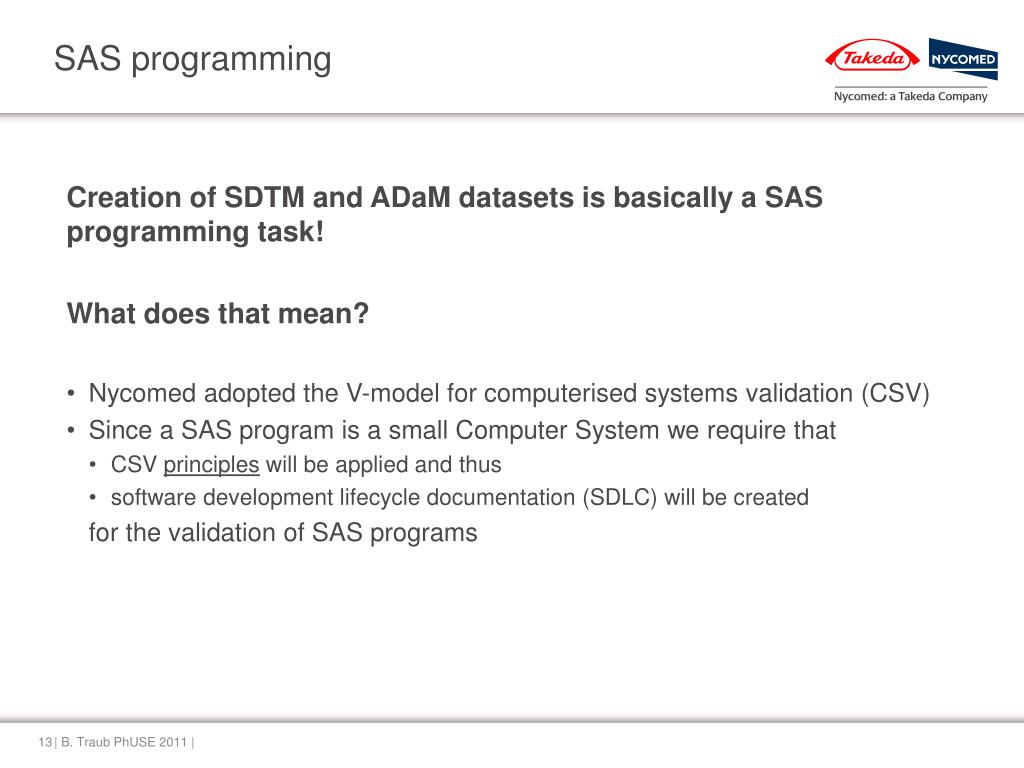 SAS programming Creation of SDTM and ADaM datasets is basically a SAS programming task! What does that mean? • Nycomed adopted the V-model for computerised systems validation (CSV) • Since a SAS program is a small Computer System we require that • CSV principles will be applied and thus • software development lifecycle documentation (SDLC) will be created for the validation of SAS programs | B. Traub PhUSE 2011 |