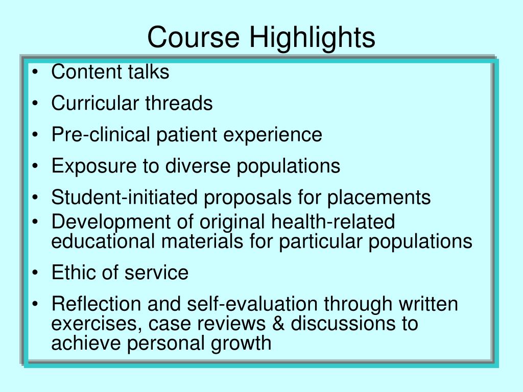 Course Highlights • Content talks • Curricular threads • Pre-clinical patient experience • Exposure to diverse populations • Student-initiated proposals for placements • Development of original health-related educational materials for particular populations • Ethic of service • Reflection and self-evaluation through written exercises, case reviews & discussions to achieve personal growth