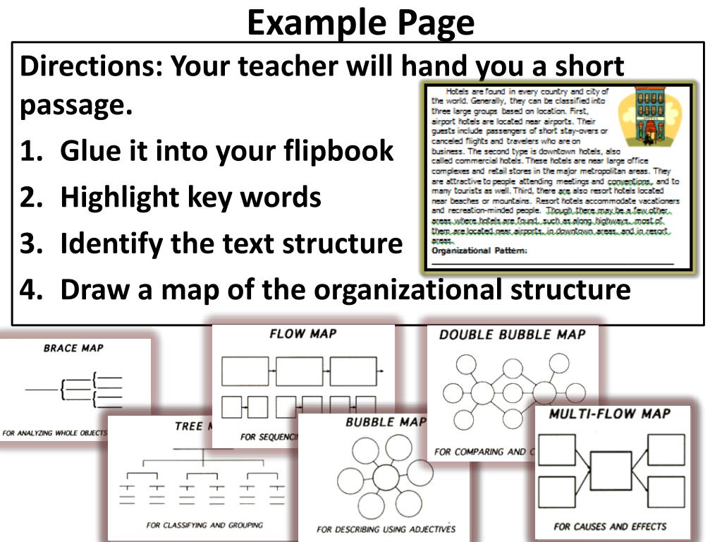 Example Page Directions: Your teacher will hand you a short passage. • Glue it into your flipbook • Highlight key words • Identify the text structure • Draw a map of the organizational structure