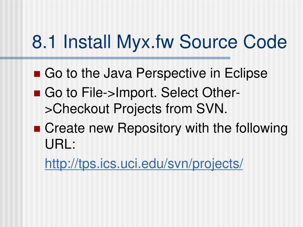 8.1 Install Myx.fw Source Code • Go to the Java Perspective in Eclipse • Go to File->Import. Select Other->Checkout Projects from SVN. • Create new Repository with the following URL: http://tps.ics.uci.edu/svn/projects/