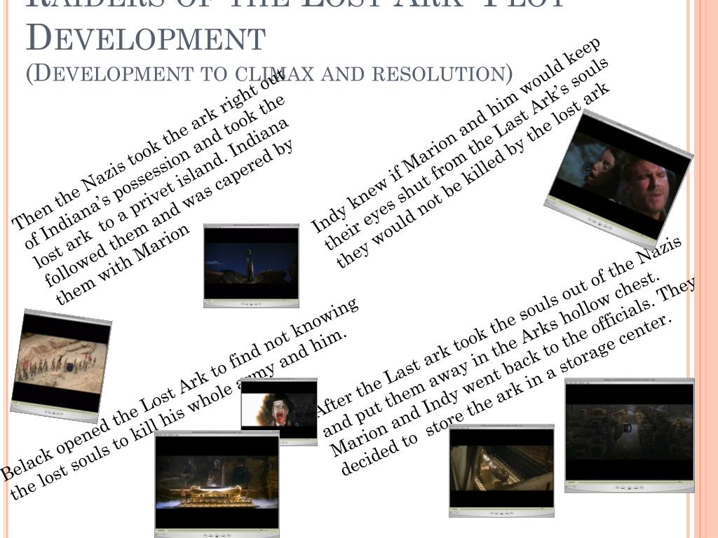 Raiders of the Lost Ark Plot Development (Development to climax and resolution) Indy knew if Marion and him would keep their eyes shut from the Last Ark’s souls they would not be killed by the lost ark Then the Nazis took the ark right out of Indiana’s possession and took the lost ark to a privet island. Indiana followed them and was capered by them with Marion After the Last ark took the souls out of the Nazis and put them away in the Arks hollow chest. Marion and Indy went back to the officials. They decided to store the ark in a storage center. Belack opened the Lost Ark to find not knowing the lost souls to kill his whole army and him.