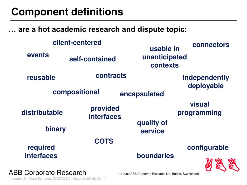 Component definitions … are a hot academic research and dispute topic: client-centered connectors usable in unanticipated contexts events self-contained contracts reusable independently deployable compositional encapsulated visual programming provided interfaces distributable quality of service binary COTS required interfaces configurable boundaries