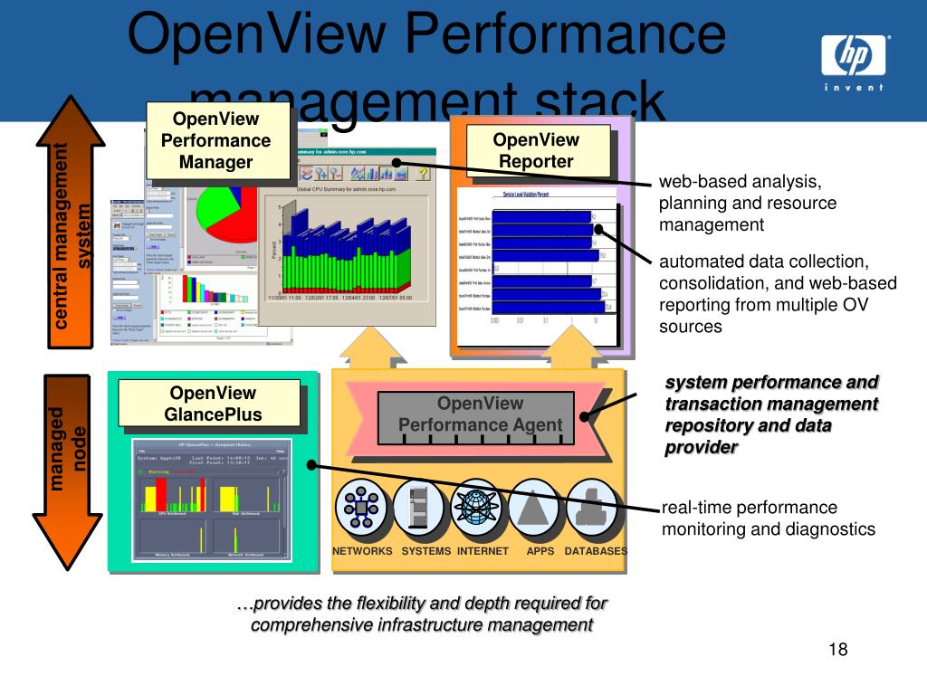 OpenView Reporter OpenView Performance Manager automated data collection, consolidation, and web-based reporting from multiple OV sources OpenView Performance Agent real-time performance monitoring and diagnostics NETWORKS SYSTEMS INTERNET APPS DATABASES OpenView Performance management stack web-based analysis, planning and resource management central management system system performance and transaction management repository and data provider OpenView GlancePlus managed node …provides the flexibility and depth required for comprehensive infrastructure management