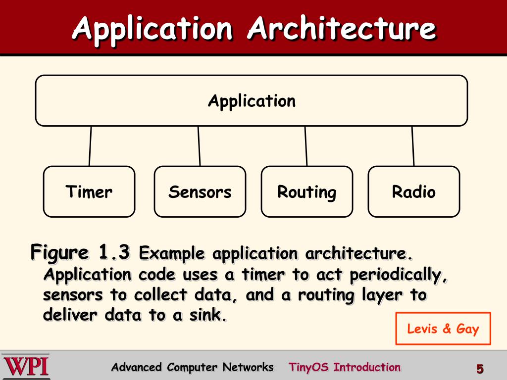 Application Architecture Application • Timer • Sensors • Routing • Radio Levis & Gay Advanced Computer Networks TinyOS Introduction Figure 1.3 Example application architecture. Application code uses a timer to act periodically, sensors to collect data, and a routing layer to deliver data to a sink.