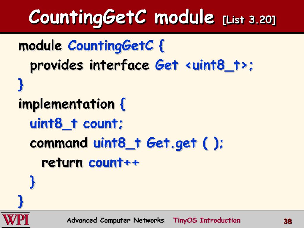 CountingGetC module [List 3.20] module CountingGetC { provides interface Get <uint8_t>; } implementation { uint8_t count; command uint8_t Get.get ( ); return count++ } } Advanced Computer Networks TinyOS Introduction
