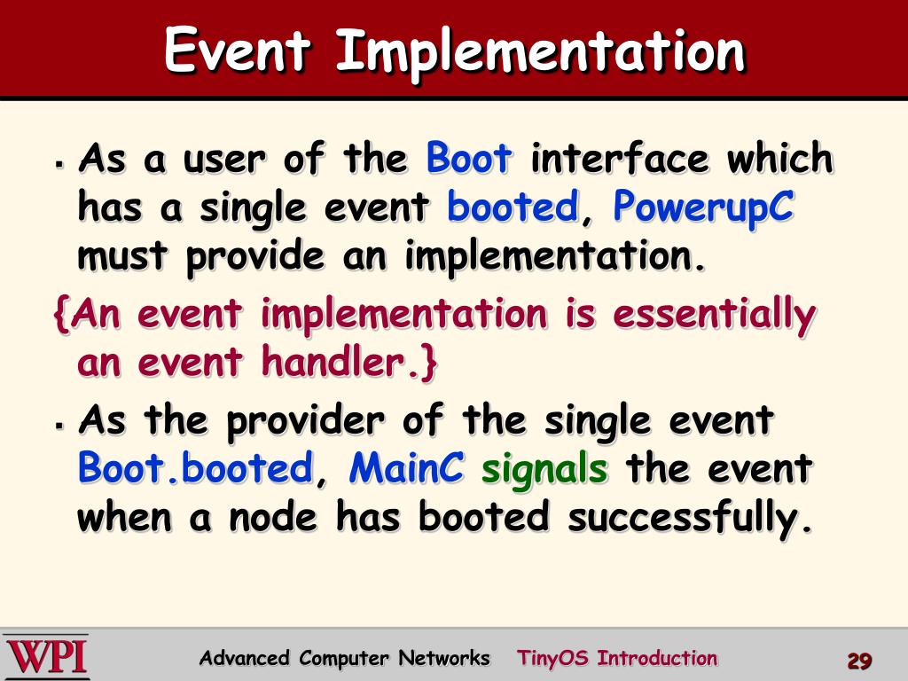 Event Implementation As a user of the Boot interface which has a single event booted, PowerupC must provide an implementation. {An event implementation is essentially an event handler.} As the provider of the single event Boot.booted, MainCsignals the event when a node has booted successfully. Advanced Computer Networks TinyOS Introduction
