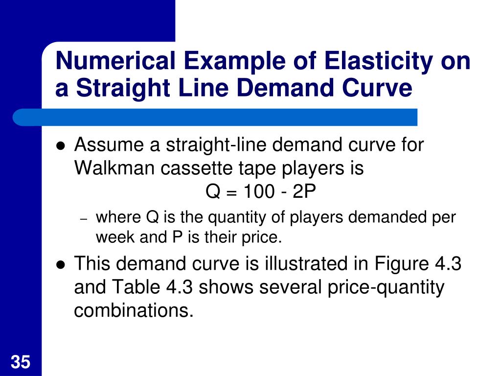 Numerical Example of Elasticity on a Straight Line Demand Curve • Assume a straight-line demand curve for Walkman cassette tape players is Q = 100 - 2P • where Q is the quantity of players demanded per week and P is their price. • This demand curve is illustrated in Figure 4.3 and Table 4.3 shows several price-quantity combinations.