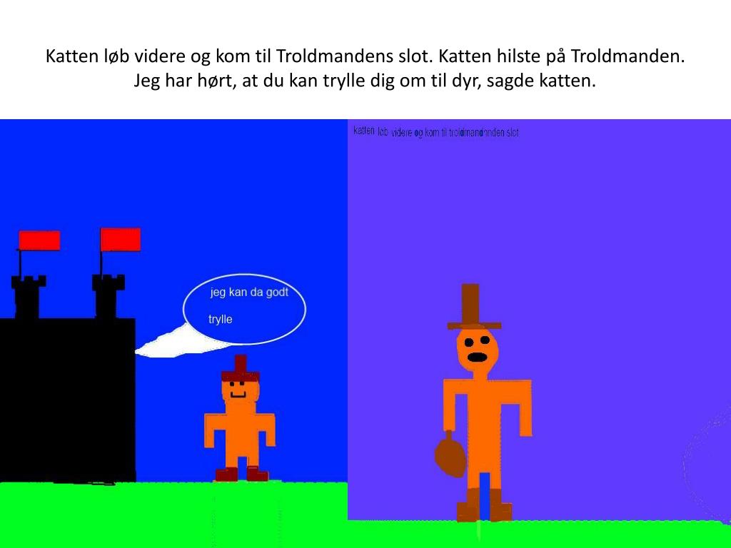 Katten løb videre og kom til Troldmandens slot. Katten hilste på Troldmanden. Jeg har hørt, at du kan trylle dig om til dyr, sagde katten.