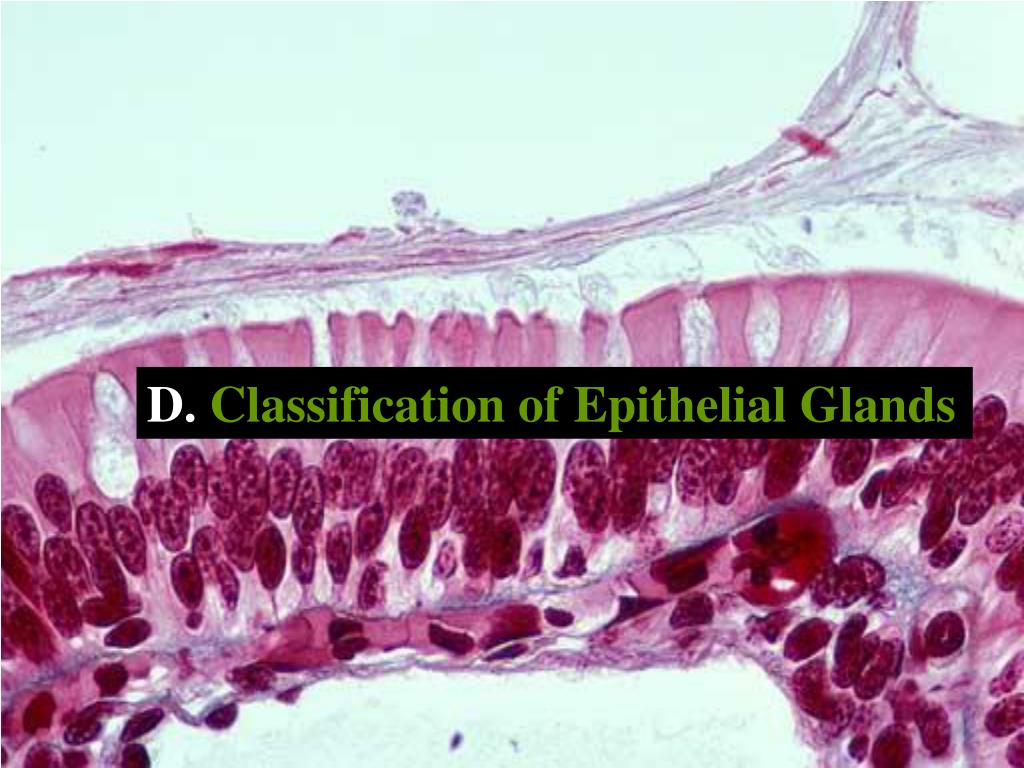 1. Based on Function a. Exocrine b. Endocrine 2. Based on Complexity a. Unicellular b. Multi-cellular 3. Based on Mode of Secretion a. Merocrine b. Apocrine c. Holocrine