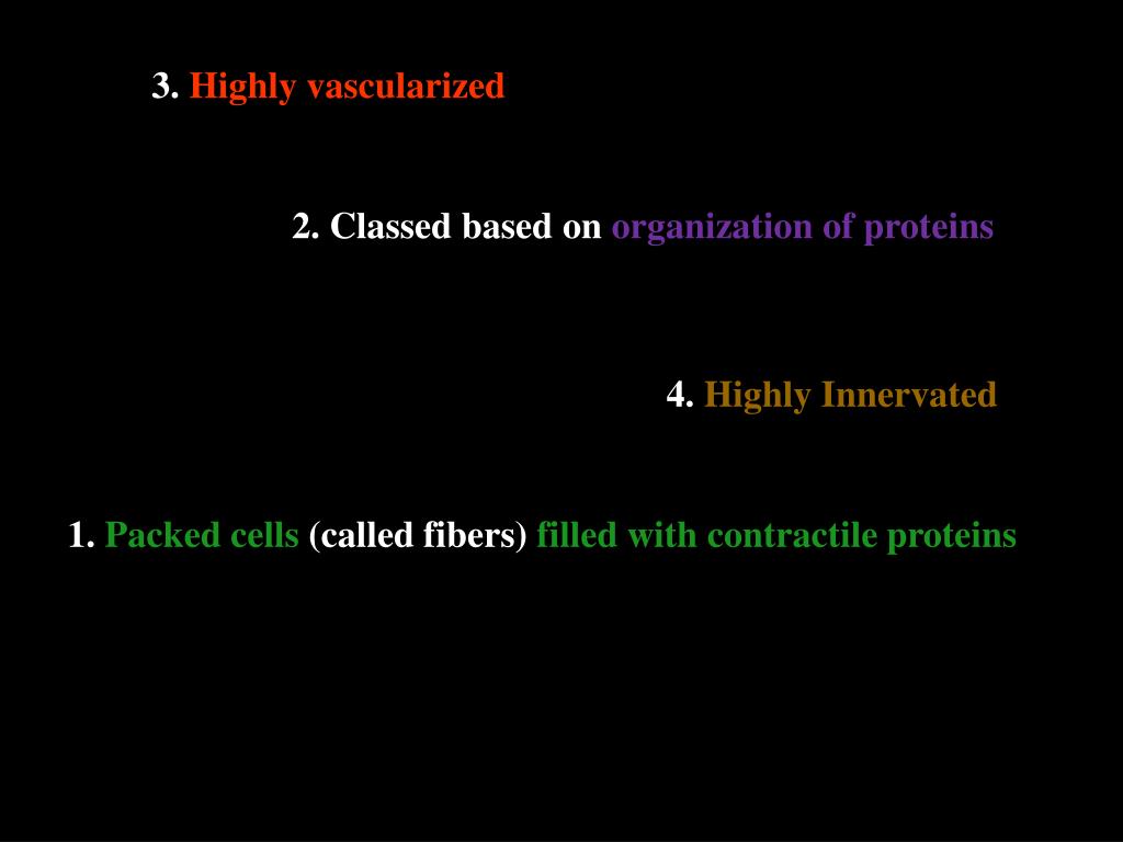 3. Highly vascularized 2. Classed based on organization of proteins 4. Highly Innervated 1. Packed cells (called fibers) filled with contractile proteins