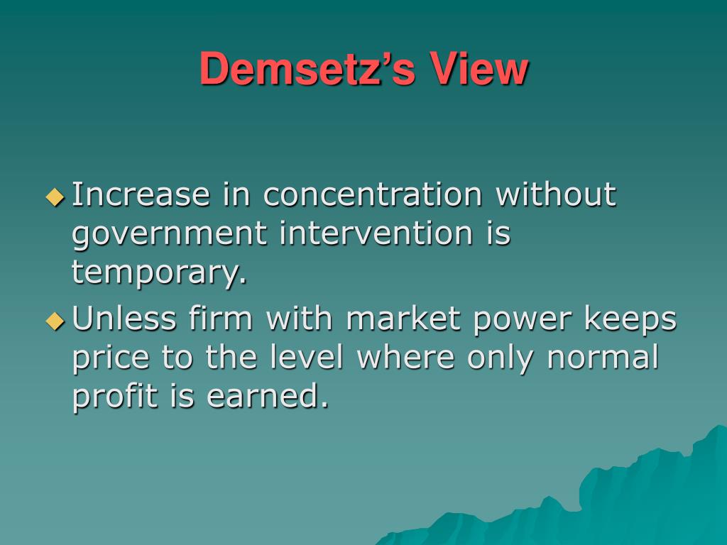 Demsetz’s View • Increase in concentration without government intervention is temporary. • Unless firm with market power keeps price to the level where only normal profit is earned.