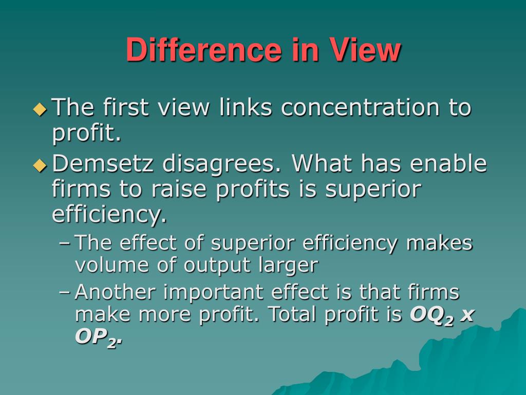 Difference in View • The first view links concentration to profit. • Demsetz disagrees. What has enable firms to raise profits is superior efficiency. • The effect of superior efficiency makes volume of output larger • Another important effect is that firms make more profit. Total profit is OQ2 x OP2.
