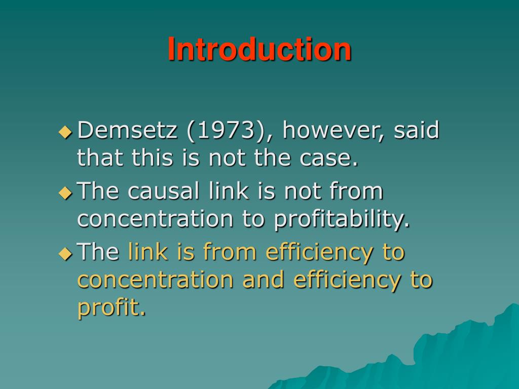 Introduction • Demsetz (1973), however, said that this is not the case. • The causal link is not from concentration to profitability. • The link is from efficiency to concentration and efficiency to profit.