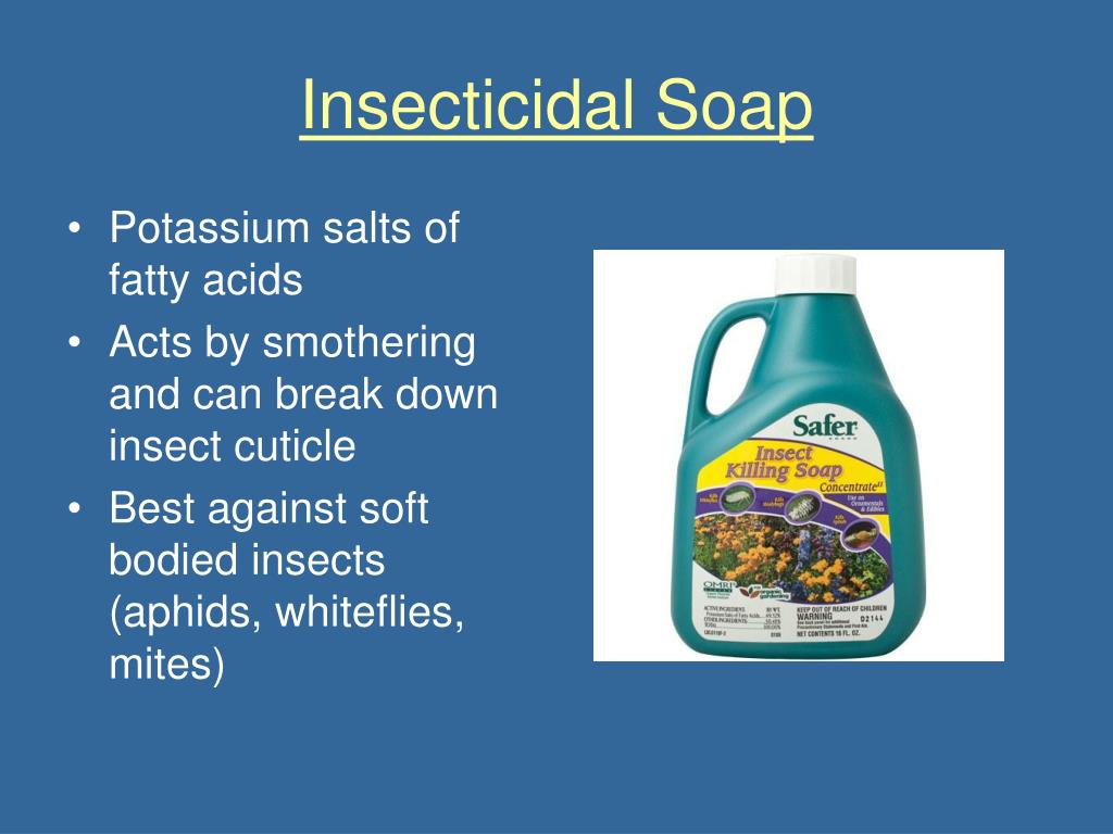 Insecticidal Soap • Potassium salts of fatty acids • Acts by smothering and can break down insect cuticle • Best against soft bodied insects (aphids, whiteflies, mites)