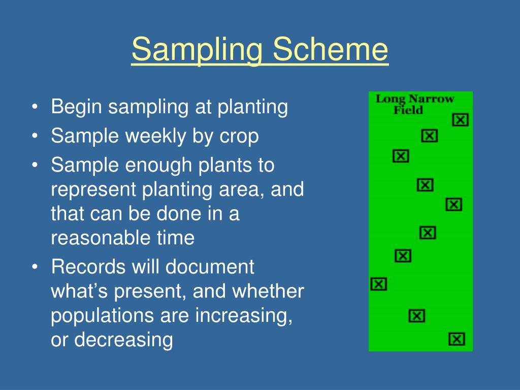 Sampling Scheme • Begin sampling at planting • Sample weekly by crop • Sample enough plants to represent planting area, and that can be done in a reasonable time • Records will document what’s present, and whether populations are increasing, or decreasing