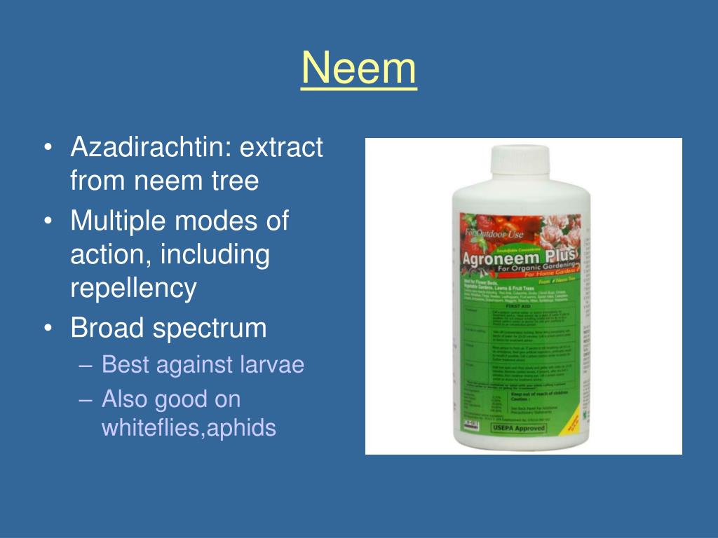 Neem • Azadirachtin: extract from neem tree • Multiple modes of action, including repellency • Broad spectrum • Best against larvae • Also good on whiteflies,aphids